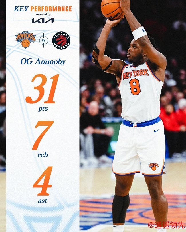 唐斯15投11中轰下31分10篮板7助攻,阿奴诺比面对老东家15投13中超级高效地轰下31分7篮板4助攻,尼克斯轻松战胜猛龙取得4连胜,19胜10负排名东部第三。