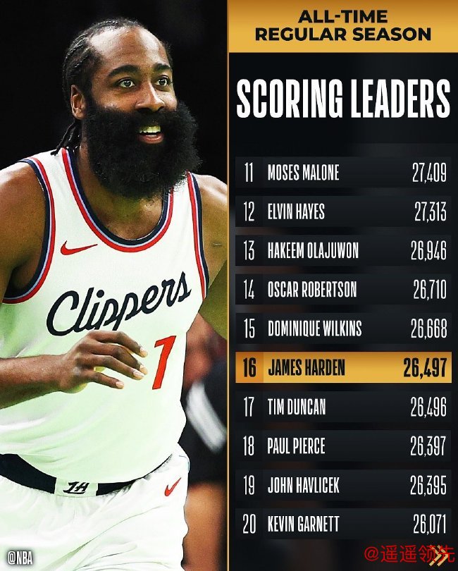 哈登生涯总得分超越邓肯升至NBA历史得分榜第16位,但在下半场表现不佳,遭遇里程悲。快船16胜13负排在东部第八。